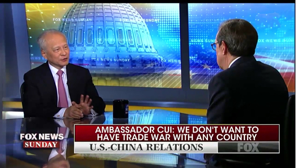 圖:中國駐美大使崔天凱接受美國霍士電視台訪問時表示,美國副總統彭斯近期發表的言論中所有對華指控毫無根據/網上圖片