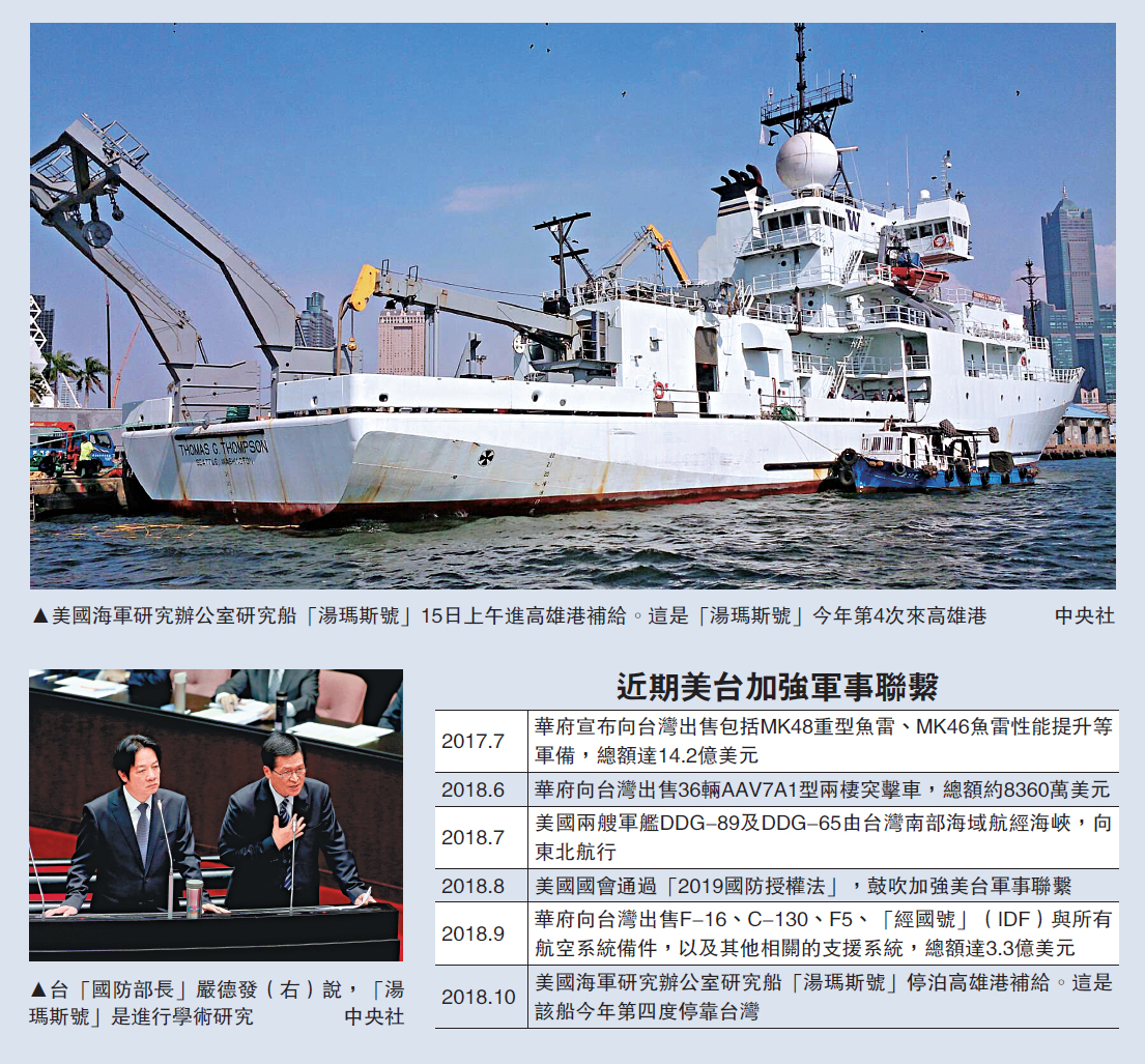 隸屬美國海軍的研究船「湯瑪斯號」14日停泊高雄港補給。台灣前海軍官員認為,高雄港範圍大,若要低調可停放在不起眼處,雖是今年第4度停泊,但在中美角力的時間點,加之傳出美方將於下月在南海、台海附近軍演,引起各界關注。台軍方稱「純學術交流」。有學者表示,這是美方在探測大陸方面的底線,同時也可能在為下月的軍演做準備。不管其意圖如何,美軍方船隻停泊高雄,是意在加強美台軍事聯繫,必進一步損害兩岸關係與台海和平。/大公報記者 蘇榕蓉報道