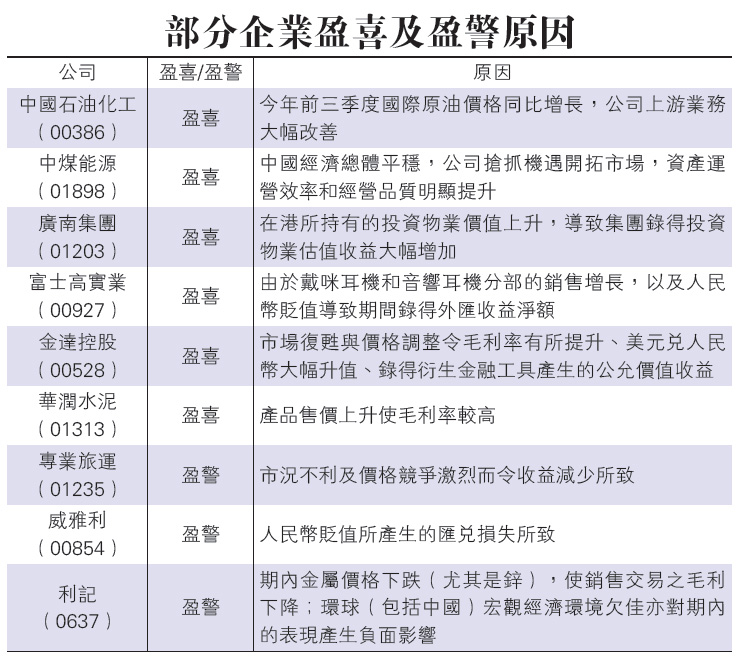 大公報統計過去一個月就截至9月底及12月底業績發出盈利預警的公司,合共有32間公司發出盈警或盈喜,其中發盈喜公司有22間,僅較去年同期的24間為少;至於發盈警的公司則有10間,較去年同期的19間大幅減少。雖然盈喜公司數目仍佔大多數,但細心留意的話,仍可發現盈警股的通告中,已反映經濟放緩及人民幣貶值的影響。如利記(00637)就指環球(包括中國)宏觀經濟環境欠佳對期內的表現產生負面影響;威雅利(00854)稱人民幣貶值產生的匯兌損失;專業旅運(01235)表示,市況不利及價格競爭激烈而令收益減少。