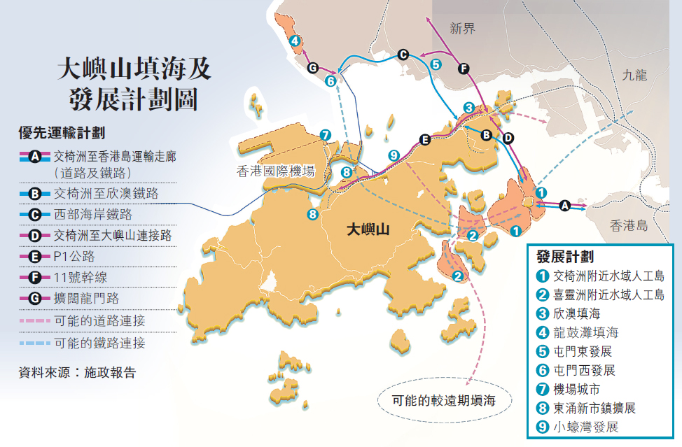「明日大嶼」提出發展大嶼山的五大方向,包括在中部水域填海1700公頃,並興建新的運輸走廊,以道路和鐵路連接屯門沿海、北大嶼山、中部水域人工島及港島北。計劃引起社會不少回響。