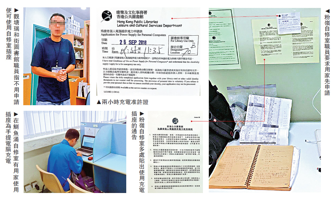 惟每間自修室對充電規則的把關程度竟然是「各處鄉村各處例」。記者隨機抽查港九新界共四間自修室,發現執行規則的鬆緊程度相差甚遠,可說是「自由發揮」。以最嚴格的粉嶺自修室為例,那裏當眼處及每格座位都貼出相關規則。職員巡視發現用家沒有申請,便會要求他們填寫申請表格。