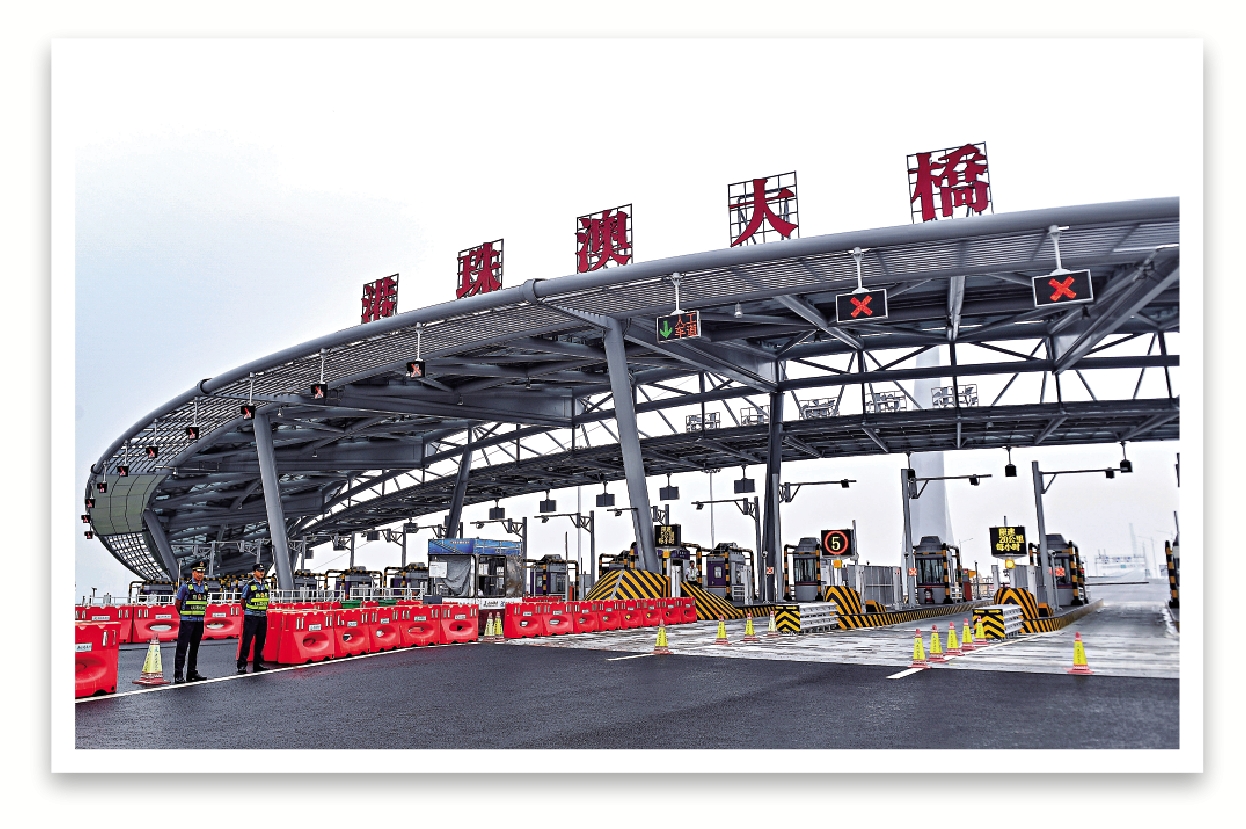 從珠海、澳門口岸出來的車輛,全部都將經過港珠澳大橋收費站上橋。在蔚藍的天空襯托下,港珠澳大橋收費站顯得更加氣派。大橋收費站前有20條匝道,視野非常開闊。收費站建築採用白色的設計,極具未來感。從珠海方向駛向香港方向時,左邊是珠海知名的情侶路,右上角是澳門林立的高樓建築。