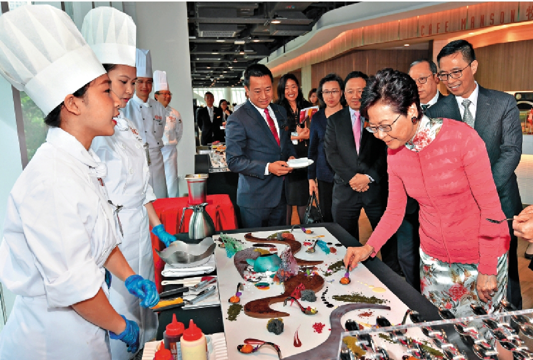 特首林鄭月娥昨日主持開幕禮。她致辭時表示,政府支持人才培訓,學院提供職業和專業培訓,為學生提供技術、全人發展及國際經驗,有利本港飲食業發展。她又稱,職訓局多年來已培育約25萬名學生,然而職業訓練仍未獲社會上部分人認同。