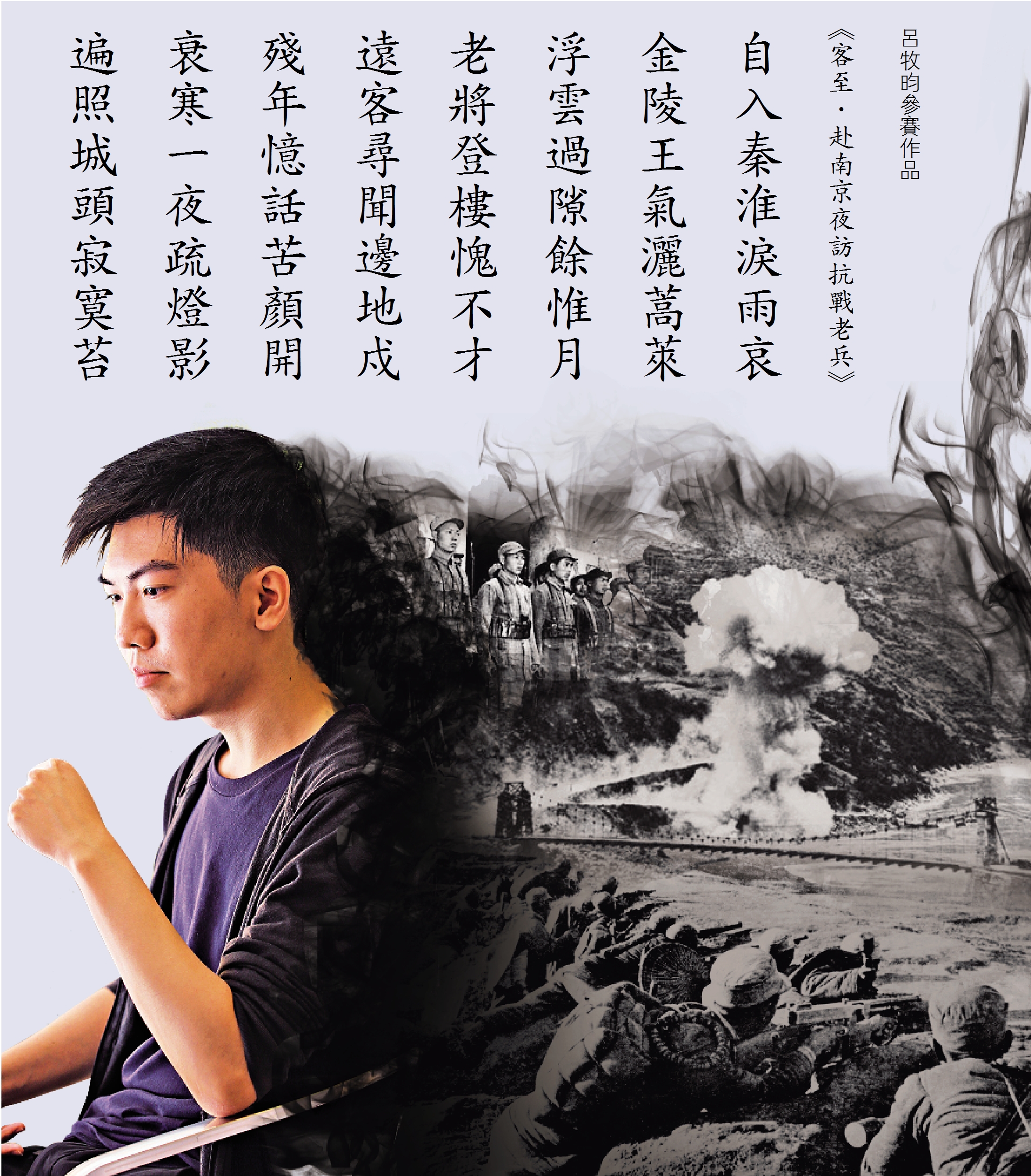 「聶紺弩盃」大學生中華詩詞邀請賽,創辦於2015年,今年已踏入第四屆,本屆大賽以「誦新時代.詠新征程」為主題,香港、澳門及海峽兩岸共348所高校數千名學生踴躍參加。呂牧昀在老師啟迪下,創作《客至.赴南京夜訪抗戰老兵》一詩作為參賽作品。「我想通過這首詩紀念抗戰老兵,他們的英雄故事應該讓更多人知道。」
