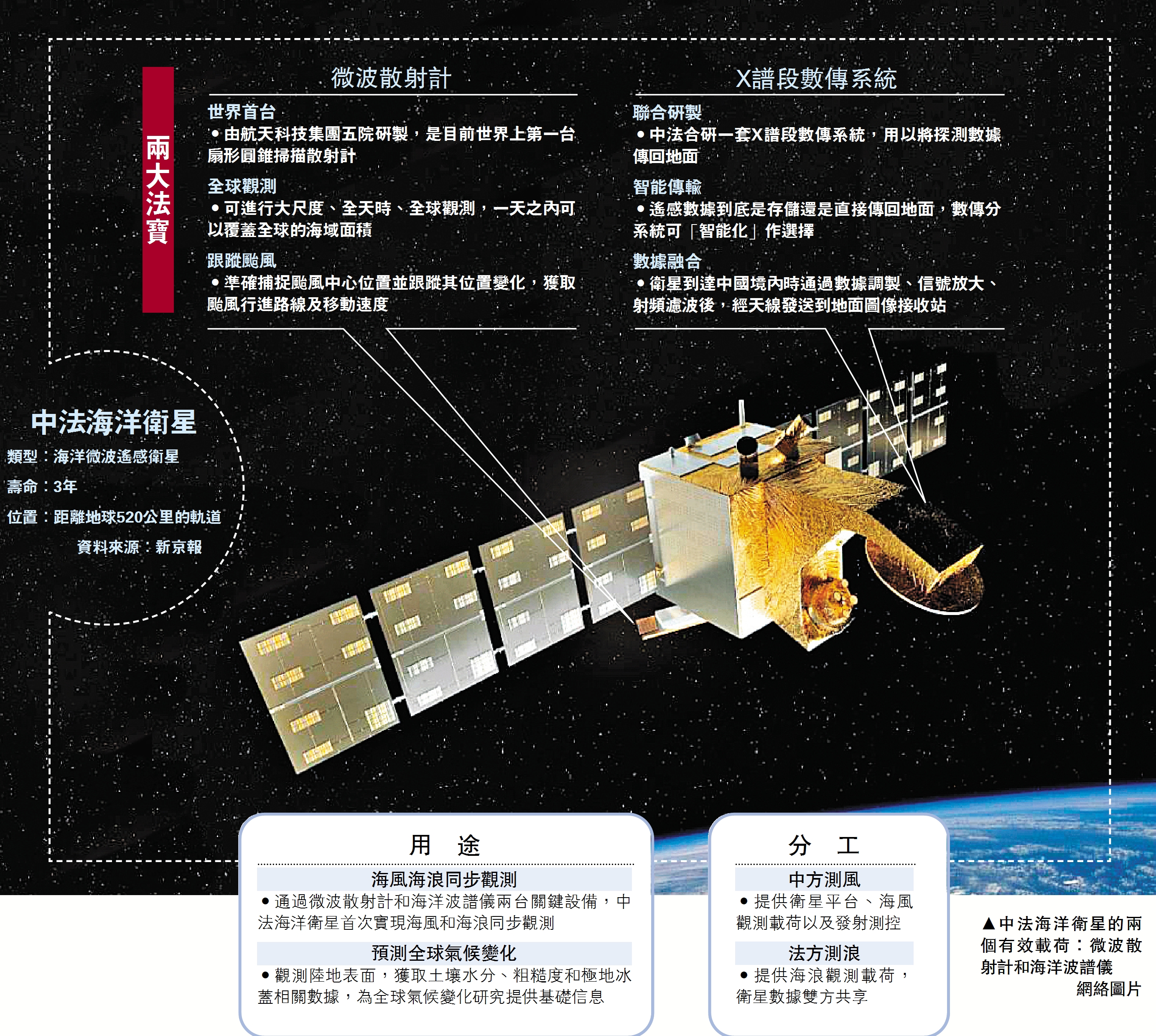 衛星裝載了中方研製的微波散射計和法方研製的海洋波譜儀,將在距地520公里的軌道上24小時不間斷工作,實現在全球範圍內對海洋表面風浪的大面積、高精度同步觀測。同時,通過對海洋、大氣有關的科學實驗和科學應用的研究,進一步科學認知海洋動力環境的變化規律,提高對巨浪、海洋熱帶風暴、風暴潮等災害性海況預報的精度與時效。