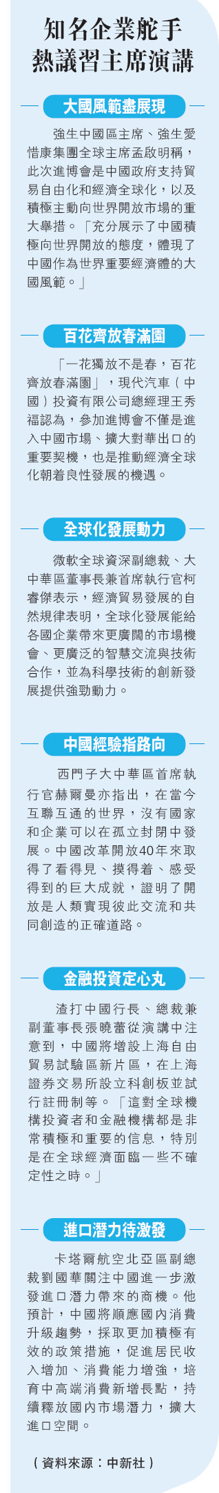 各國領導人表示,中國舉辦國際進口博覽會充分展現了中方對外開放的包容姿態和負責任的大國擔當。他們高度評價、深度認同習近平在開幕式上發表的主旨演講,表示各國非常重視中國市場,普遍看好中國發展前景,願深挖同中方合作潛力,推動雙邊貿易增長,促進世界自由貿易發展。
