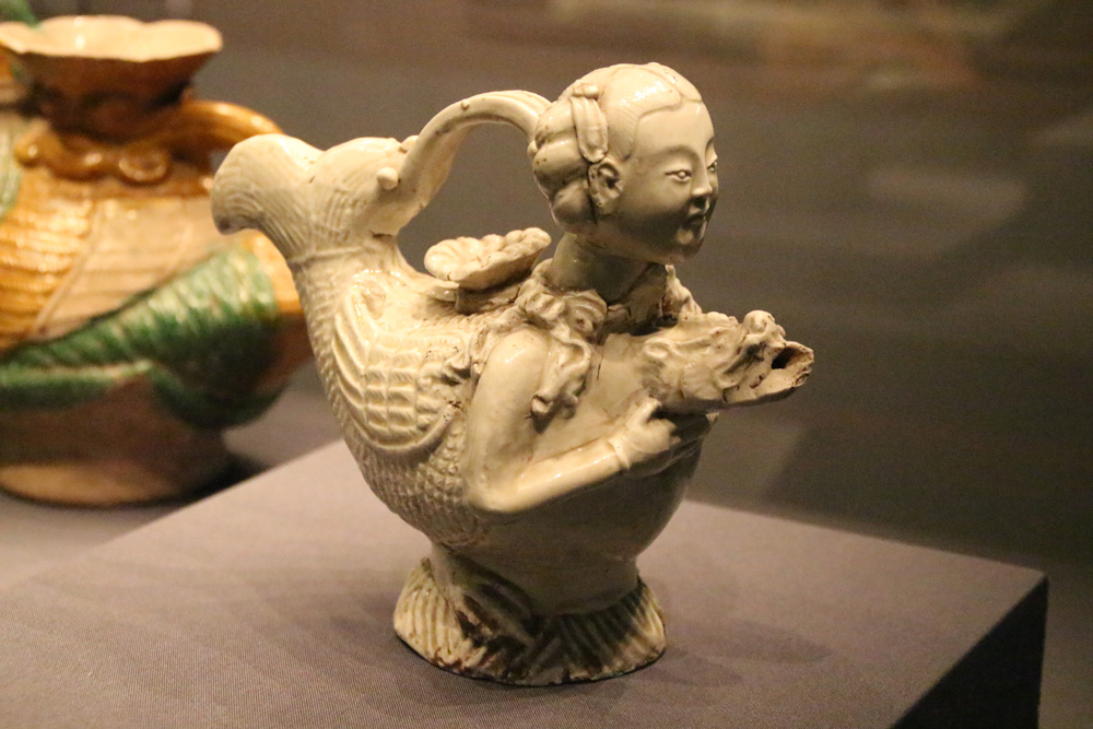 遼代白瓷名滿天下。人首摩竭形壺是遼瓷中罕見的造型。壺前端為一眉清目秀的少女,頭戴髮髻,頸臂間有綵帶、花朵做貼飾,雙手捧一螭首短注。壺身呈魚形,尾鰭上翹,身刻細鱗片,腹兩側各附一欲展翅的飛翼,背中部有一蓮瓣形注口,頸部和尾鰭之間有一橋形提樑。摩竭是印度神話中的一種動物,長鼻利齒、魚身魚尾,漢譯作摩竭、摩伽羅等。四世紀時,它的形象隨着佛教而傳入中國。這件白瓷壺將人、魚、鳥、螭等動物混合為一體,構思絕妙。