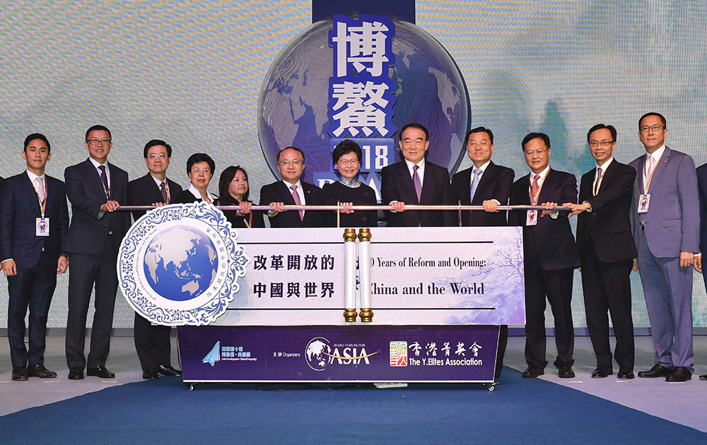 圖:2018博鰲亞洲論壇青年會議(香港)開幕,林鄭月娥(右六)、王志民(左六)、謝鋒(右四)、李保東(右五)、阿羅約(左五)、陳馮富珍(左四)及其他嘉賓主持開幕典禮