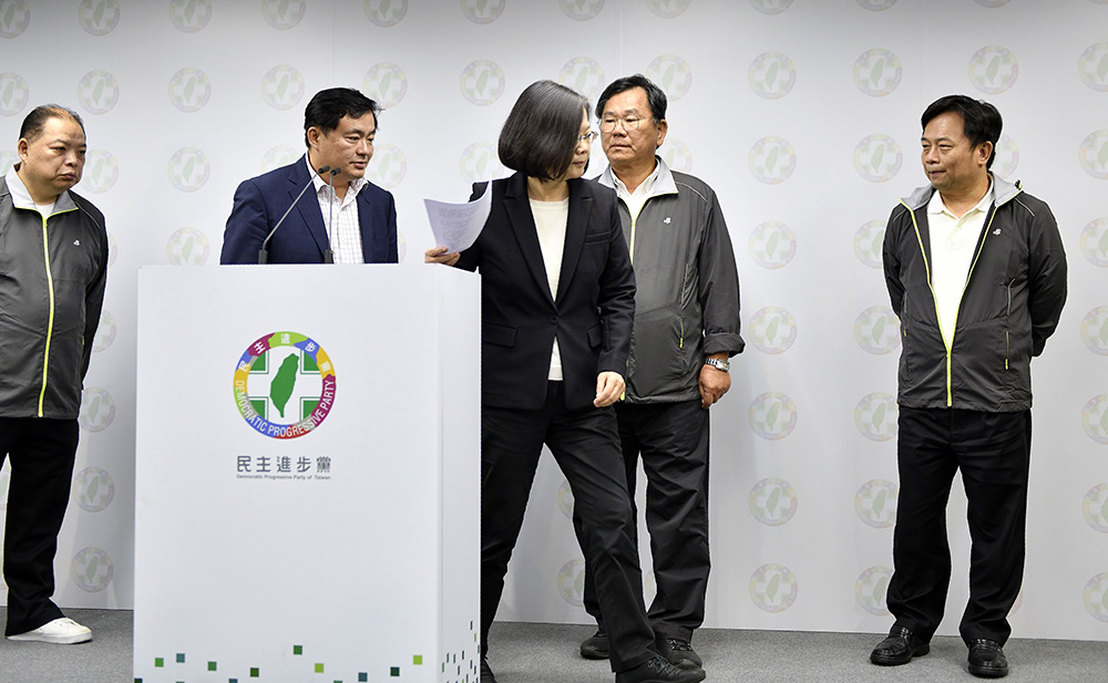 圖:「九合一」選舉失利,兼任民進黨主席的台灣地區領導人蔡英文(中)24日表示對結果負起完全責任,辭去主席一職/法新社