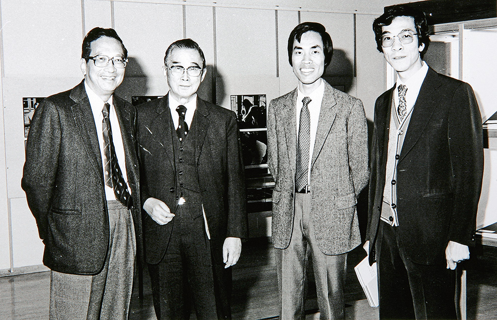 圖:利榮森(左一)、林業強(右二)1982年於中大文物館,其餘二人為考古學家鄭德坤(左二)及中大文物館營休館長屈志仁