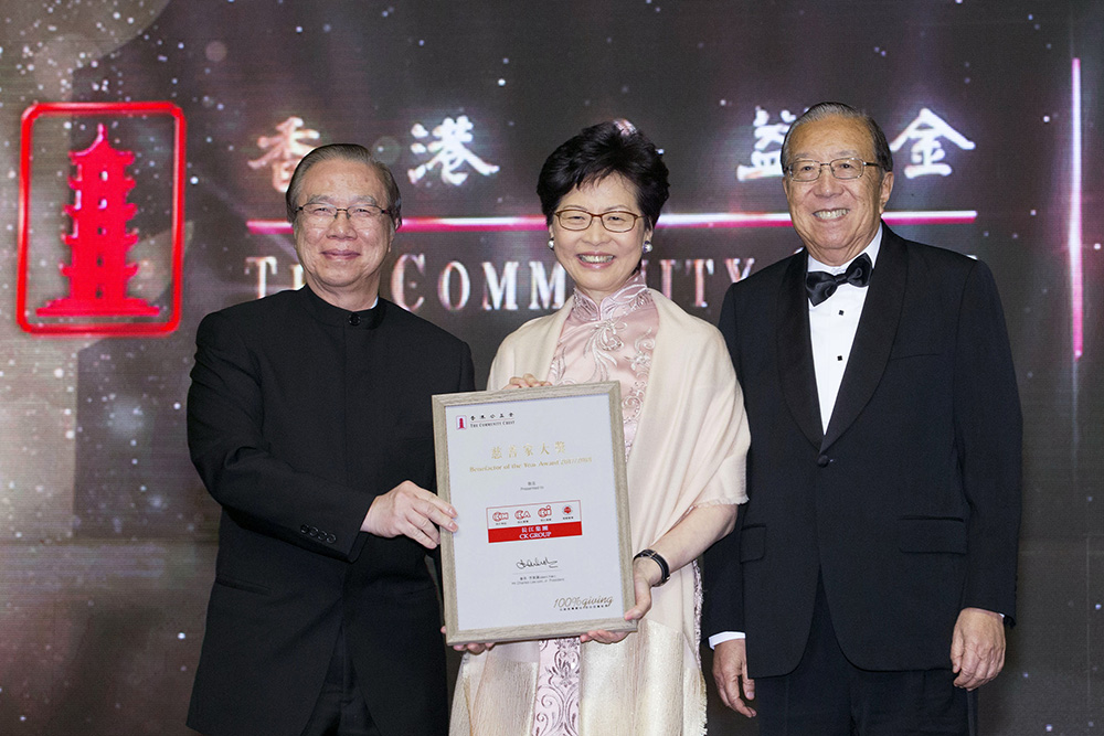 為善最樂,福有攸歸!今年是公益金50周年,前晚舉行慈善晚宴及頒獎,長江集團再獲頒「慈善家大獎」,由長江實業集團有限公司副董事總經理甘慶林(圖左)在公益金會長李業廣(圖右)的見證下,代表長江集團接受由行政長官林鄭月娥(圖中)頒發殊榮。值得慶賀之餘,最重要是善款可以惠澤社群。