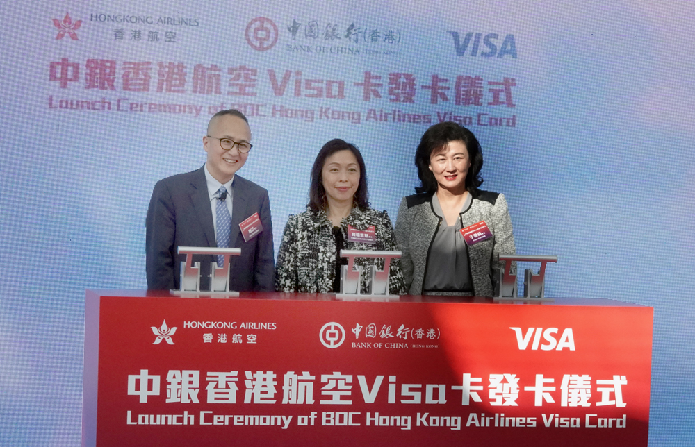圖:中銀香港副總裁龔楊恩慈(中)、香港航空首席品牌官劉江(左)及Visa大中華區總裁于雪莉(右)主持中銀香港航空Visa卡發卡儀式\大公報記者黃洋港攝