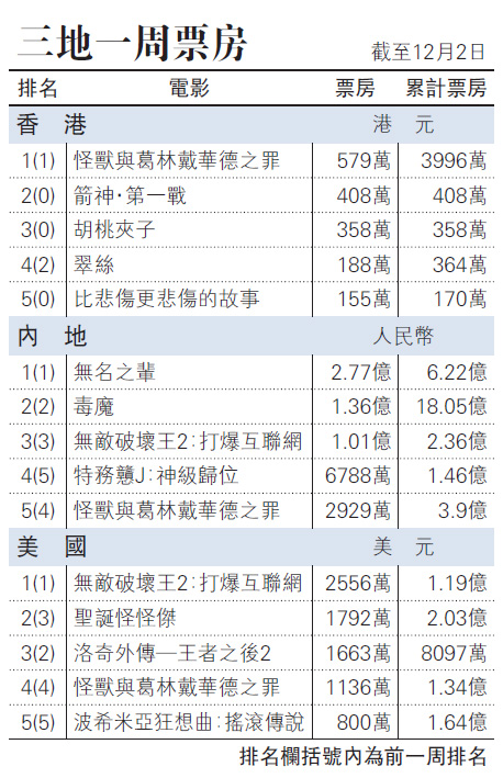 上周有兩部大片上映,《箭神.第一戰》(Robin Hood)和《胡桃夾子》(The Nutcracker and the Four Realms),可是一周票房仍與前一周相差無幾,收二千三百三十一萬港元,較前一周少收一百一十五萬港元。而排名榜方面,《怪獸與葛林戴華德之罪》(Fantastic Beasts:The Crimes of Grindelwald)仍排第一位,票房累積近四千萬港元;新上畫《箭神.第一戰》排第二名,險勝排第三位的《胡桃夾子》;《翠絲》排第四位;新上畫,劉以豪和陳意涵主演的《比悲傷更悲傷的故事》,排第五位。