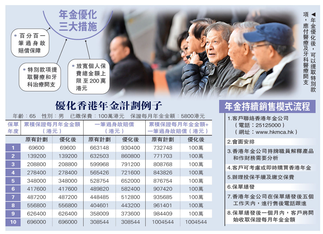 今年七月,按揭證券公司旗下香港年金推出本港首批專為長者而設的終身年金「香港年金計劃」,該計劃已於11月底完成認購手續,但反應未合乎預期。香港年金公司昨日宣布,推出三項優化措施及展開全年持續銷售模式,即日起生效。優化措施包括:若受保人身故,受益人可獲百分百一筆過身故賠償;可提取特別款項應付醫療及牙科治療開支;放寬個人保費總金額上限至200萬元。 /大公報記者 陳玉蓮