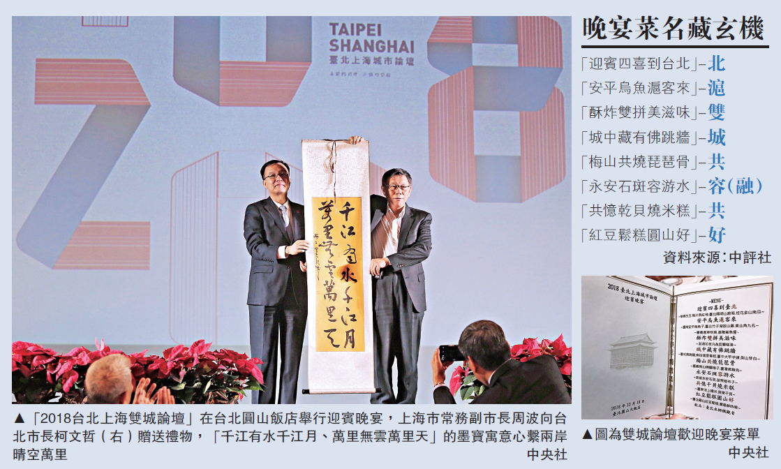 圖:「2018台北上海雙城論壇」在台北圓山飯店舉行迎賓晚宴,上海市常務副市長周波向台北市長柯文哲(右)贈送禮物,「千江有水千江月、萬里無雲萬里天」的墨寶寓意心繫兩岸晴空萬里 /中央社