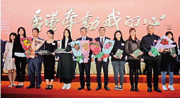 圖:在開幕式上,11名香港青少年手捧鮮花敬獻給中央美院的六位藝術家,行拜師禮