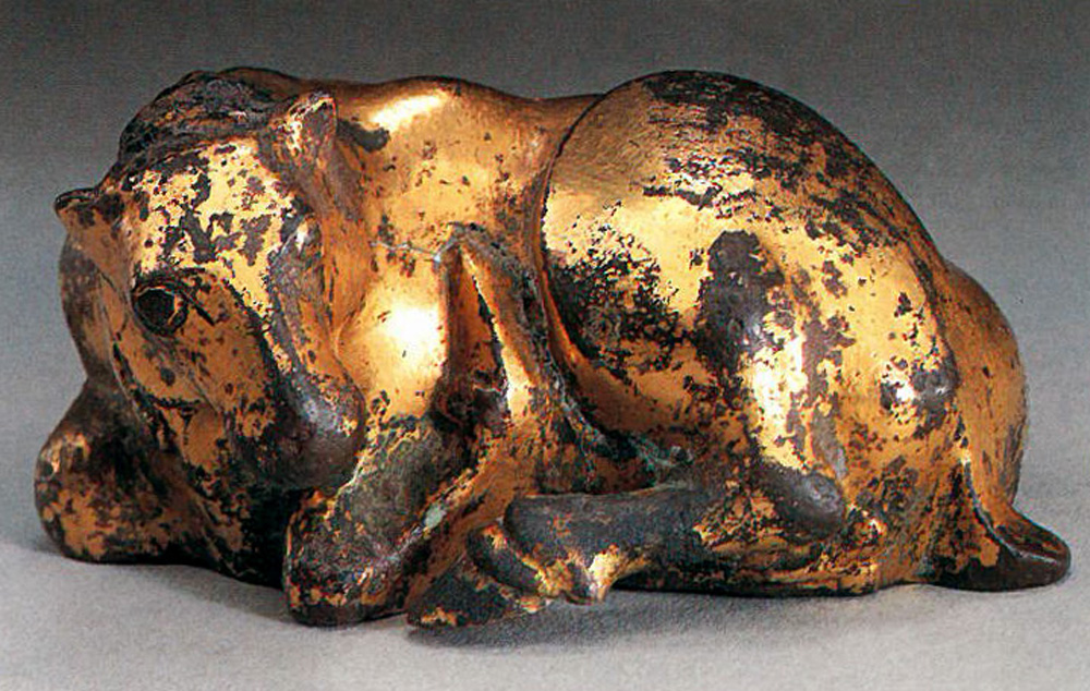 東漢時期遺留下來的古文物,絕少見有書鎮,尤其是銅鎏金者。漢代的鎏金技術,脫胎自戰國的火烤鋈錫技巧,但更熟練。當初僅限於器皿和立體動物的造型,後者風格大多雄渾勁健,圖中卧馬造型,與西漢重九千公克的一件金獸(江蘇盱眙出土)頗類似。該黃金鑄成的卧獸也是蜷伏狀,卻形如豹,乃古時用作秤錘的「金杈」(有立鈕),現藏南京博物院,可作對照及比較。漢代金銀器,不論包、鍍、鎏、錯(厝),輒以馬或走獸為主題,像河南輝縣固圍邨出土的璜,巧用七塊美玉和兩枚鎏金的銅獸製成,可說是已發現的最早鎏金器。