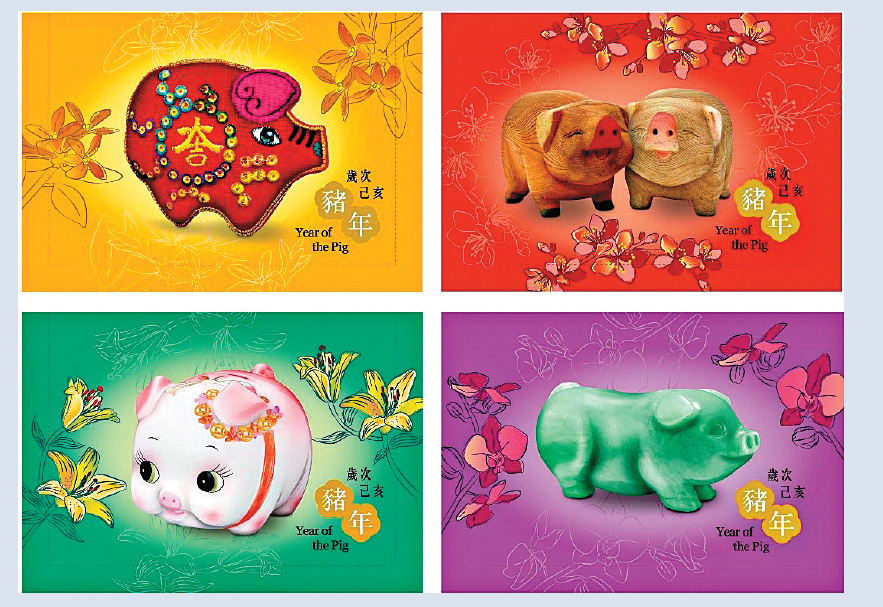 2019年為己亥豬年,「歲次己亥(豬年)」特別郵票(見圖),是香港郵政特別發行第四輯第八套賀歲生肖郵票,一套四枚,通過多種以豬為題材的工藝品,即布藝、木雕、陶器和玉器工藝,帶出寶豬賀歲主題。絲綢郵票小型張則以金豬牌為主題,背景綴以雍容華貴的牡丹,祝願來年如意吉祥,喜氣洋洋。全線郵政局今日起發售「歲次己亥(豬年)」的正式首日封,以及「十二生肖金銀郵票小型張─靈犬寶豬」和「銀箔燙壓生肖郵票─猴、雞、狗、豬」的正式紀念封,每個售價1.3元。香港郵政還推出「歲次己亥(豬年)」利是封,展示四枚豬年郵票。