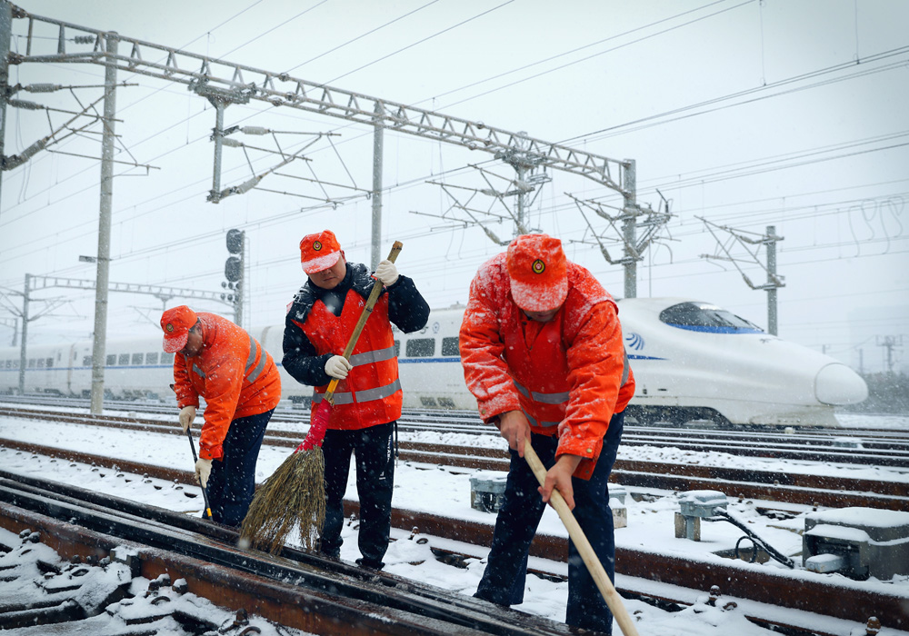 圖:30日,全國多地迎來降雪。在江西南昌,幾名工作人員在清理積雪,確保鐵路運輸安全暢通\新華社