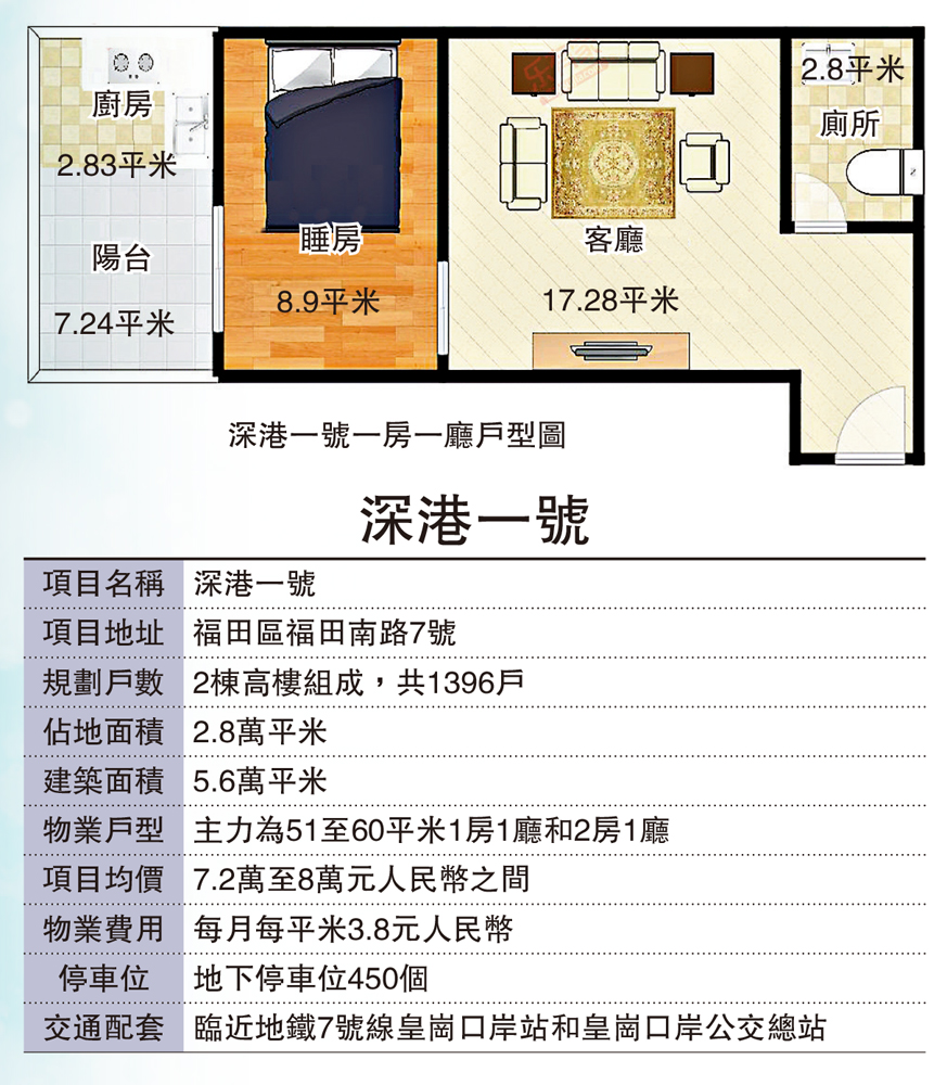 賈紹洋稱,深港一號緊靠皇崗口岸,鄰近福田口岸,地處深港大都會圈核心,交通便利和配套齊全,由2棟高樓組成,主要以小戶型為主。包括41.5的單房、42平米、49平米和50平米的一房一廳、51平米、56平米和58平米的兩房一廳等。這些戶型價格在320萬至450萬元之間,售價低廉。該樓盤房間方正實用,適合投資,不過缺點是臨街有點吵鬧。