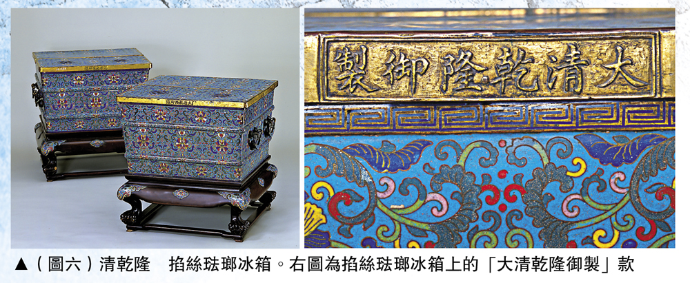 圖:(圖六)清乾隆 掐絲琺瑯冰箱。右圖為掐絲琺瑯冰箱上的「大清乾隆御製」款