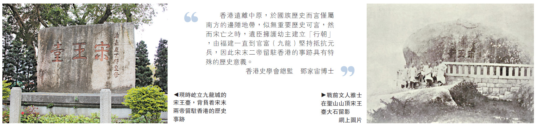 □香港遠離中原,於國族歷史而言僅屬南方的邊陲地帶,似無重要歷史可言,然而宋亡之時,遺臣擁護幼主建立「行朝」,由福建一直到官富(九龍)堅持抵抗元兵,因此宋末二帝留駐香港的事跡具有特殊的歷史意義。--香港史學會總監 鄧家宙博士