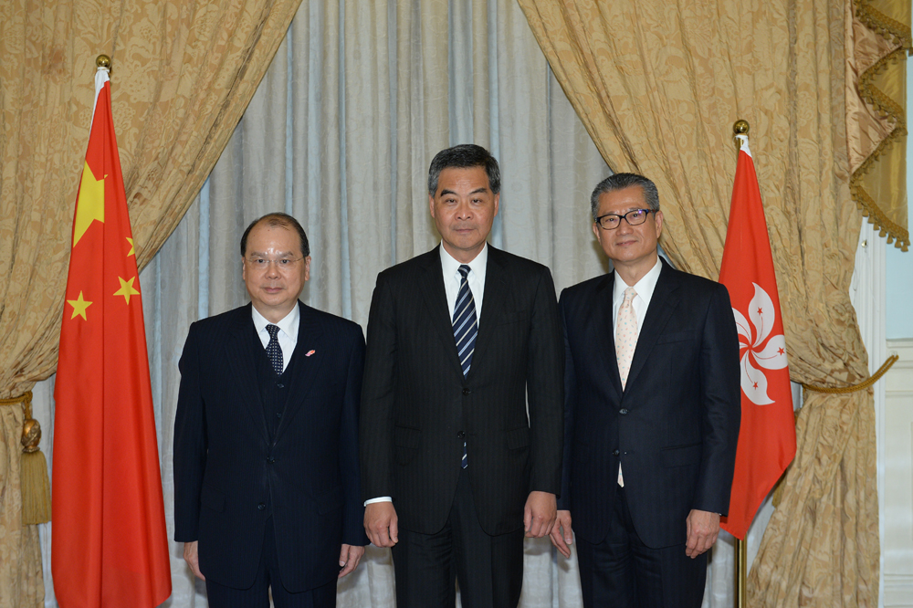 圖:行政長官梁振英(中)昨日與新任政務司司長張建宗(左)及新任財政司司長陳茂波合照。