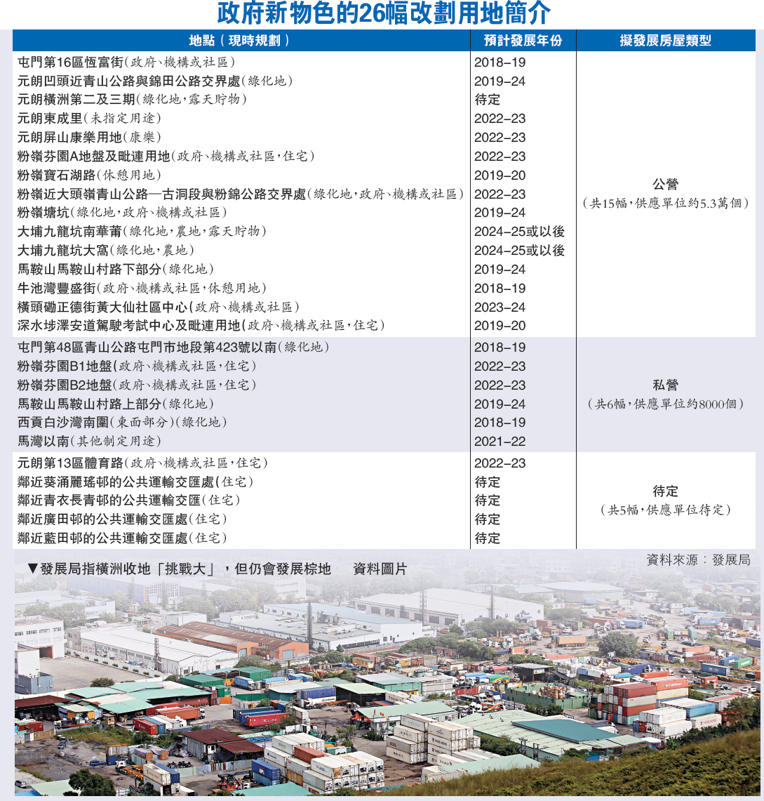 行政長官周三發表的《施政報告》公布,政府額外物色到25幅可供改劃建屋的具潛力用地。發展局昨日提交立法會的文件顯示,新物色到的用地實際共有26幅,主要是綠化地及GIC用地,分布於九龍及新界11區,當中21幅用地已敲定發展房屋類型,15幅用作公營房屋發展,料可提供約5.3萬個單位;六幅用作發展私樓,料可提供約8000個單位;另外有五幅用地未確定房屋類型(詳見表)。