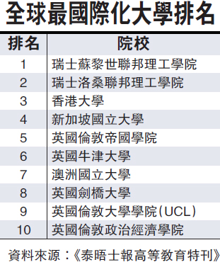 是次排名榜中,頭十位半數屬英國院校,首兩位則是瑞士的蘇黎世聯邦理工學院(ETH Zurich)及洛桑聯邦理工學院(École PolytechniqueFédérale de Lausanne)。亞洲地區方面,排名最高是港大,列第三位,成為亞洲「最國際化大學」,緊接第四位是新加坡國立大學。負責排名的《泰晤士報高等教育特刊》編輯Phil Baty說,香港擁有國際化背景,吸引來自世界各地學生及學者,創造較佳教學環境。