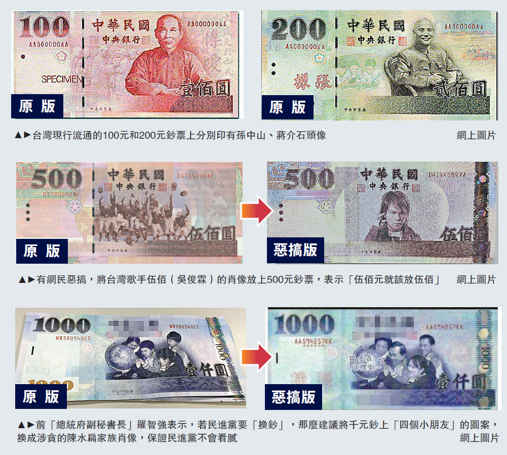 □民進黨立委高志鵬提出,將現行紙幣100元(新台幣,下同)與200元鈔票改版,拿掉孫中山、蔣中正等的肖像。此舉引發多方批評。針對綠委倡導「換鈔」的鬧劇,國民黨前立委邱毅表示,民進黨再這麼亂搞下去,一定會激盪出百萬人上街頭「倒蔡」。蔡英文的悲慘命運下場,幾乎可以預見。有網民惡搞,將歌手伍佰(吳俊霖)的肖像放上500元鈔票,表示「伍佰元就該放伍佰」。有分析指出,這還是民進黨立委搞的「去中國化」老把戲。