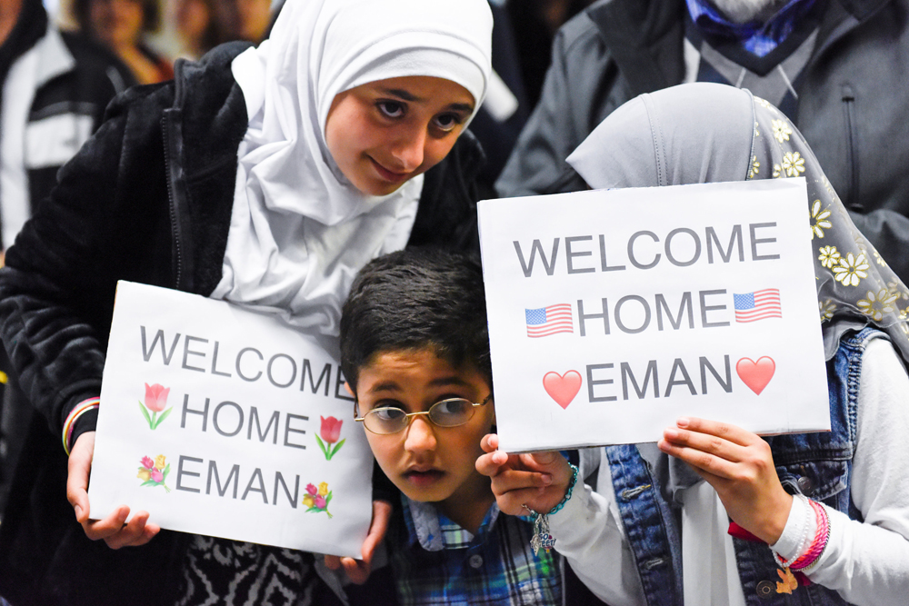 圖:也門女子阿里(左)5日在三藩市機場等候家人入境\路透社