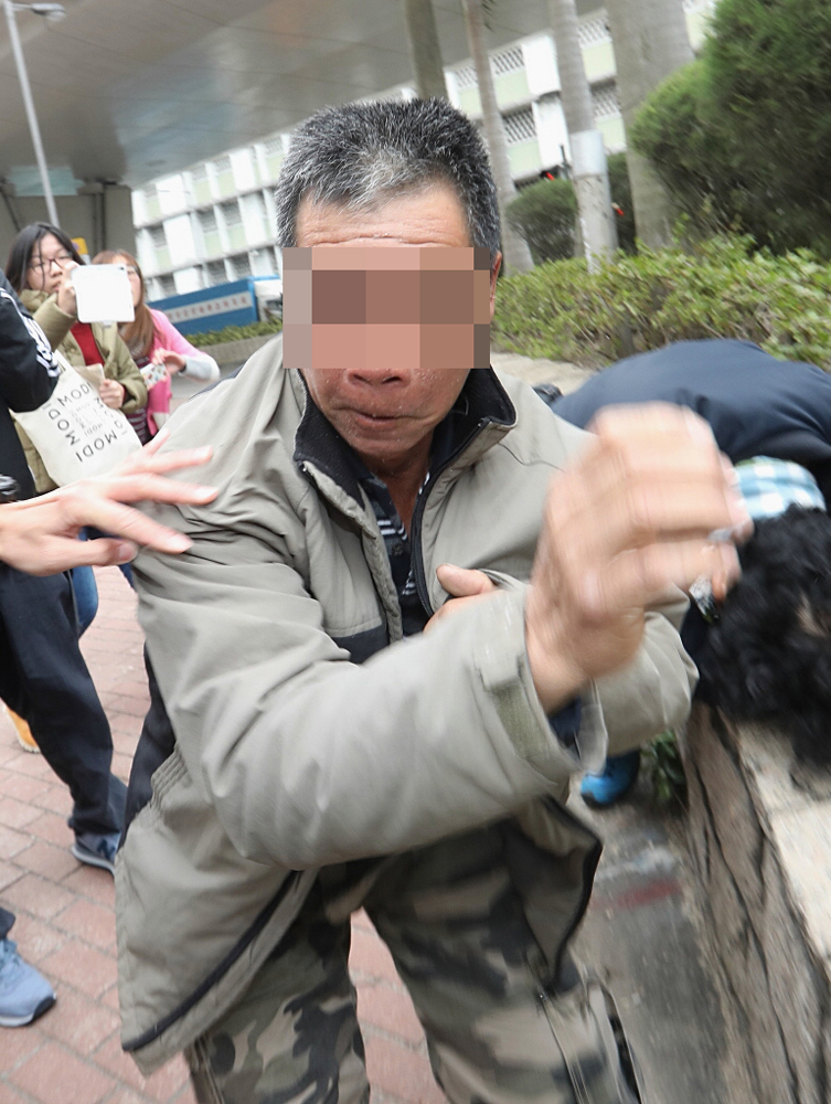 慌忙間,鍾拾起路邊大石,轉身疑對追截的記者有所行動,其後他將石頭放回路邊花槽石壆,並把頭部塞進草叢後,再手持一個拳頭般石頭,將外套蓋過頭部邊行邊喃喃自語,警員接報趕至,迅即將涉嫌傷人的鍾拘捕,並帶署扣查。至於鼻樑受傷的49歲攝影記者,經救護員敷治後清醒送院。