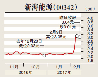 本欄在去年10月底推介過新海能源(00342),認為此股具備爆發力,當時股價約2.1元,市盈率僅4倍,是非常抵買之選!皇天不負有心人,在星期二就火箭式爆上,單日最多升79%,高見4.2元,比推介價足足升了一倍!