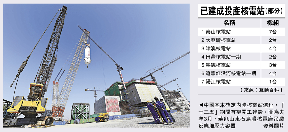 圖:中國基本確定內陸核電站選址,「十三五」期間有望開工建設。圖為去年3月,華能山東石島灣核電廠吊裝反應堆壓力容器/資料圖片