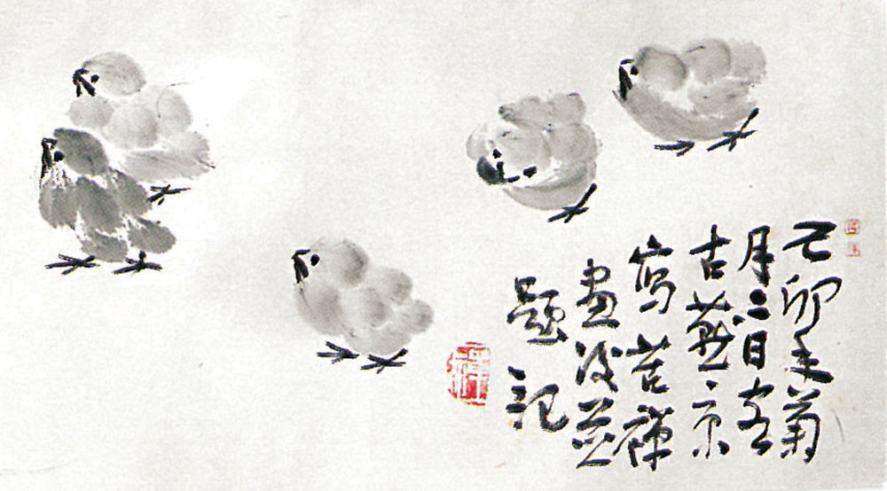附圖為近代水墨畫名家李苦禪所繪的雛雞圖(局部),原為橫軸紙本。筆簡意賅,小小生命活靈活現,趣致可愛。李苦禪原名李英杰,法名「苦禪」,早年受教於徐悲鴻,後來投拜齊白石。白石老人題其畫,也有書「白石門下只此人也」和「吾門中有李生殊」。故李苦禪畫小雞,風格近似乃師,可說一脈相承。白石老人指他「布局心既小,下筆膽又大」,「閒花野草寫來真」。他畫小雞和鷹隼(像八十三歲時所繪的《天峰雙棲》),也不例外。他晚年畫風,一如其法名,似「白藕脫泥」。