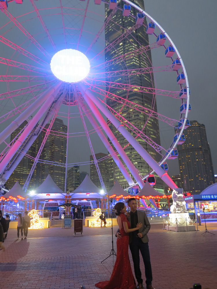圖:一對新人於中環地標摩天輪前拍攝婚紗照 /大公報記者周怡攝
