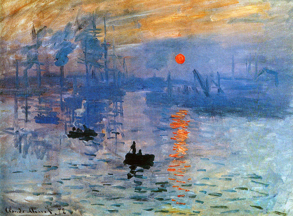 在莫奈的《日出.印象》之前,似乎沒有人發現法國諾曼第勒阿弗爾的清晨這麼美,這麼值得看,這麼入畫,這麼誘人,這麼有內容。起初莫奈也不相信。莫奈沒有早起的習慣,一八七二年十一月十四日清晨七點鐘,彷彿鬼使神差一般,莫奈睡眼惺松地站在那間小旅館臨海的窗前,他有些魂不守舍,他似乎還沉醉在昨夜夢幻般的大自然中。逐漸地,他清醒了,他震驚了,這可能是神靈的啟示,眼前的一切彷彿是夢幻的再現。滿眼的水光天色,滿眼的波光霞蔚。七色的海水,八色的朝霞,巨大煙囱發出的煙柱也被蒸騰得五顏六色,那冉冉上升的朝陽,在雲中,在煙中,在水中變幻無窮;太陽紅,從來沒有這樣紅,紅得醉人,紅得迷人,在海水的鱗波閃動下,忽兒聚,忽兒散,忽兒桃紅,忽兒橘紅,忽兒胭脂紅。海港的一切在海水和朝霞的互動中變得閃閃耀耀,朦朦朧朧,蒼蒼茫茫,似清似濁,似雲似霧,似風似煙,那就是印象中的海港日出,那便是莫奈感受中印象日出。