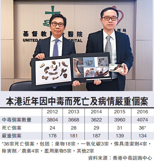 中毒諮詢中心去年接獲4074宗中毒個案,創五年新高,較2015年增加2.7%,其中嚴重個案134宗。死亡個案有36宗亦創新高,較2015年多五宗,一半與誤服過量藥物有關,其中有兩宗死因無法歸類。