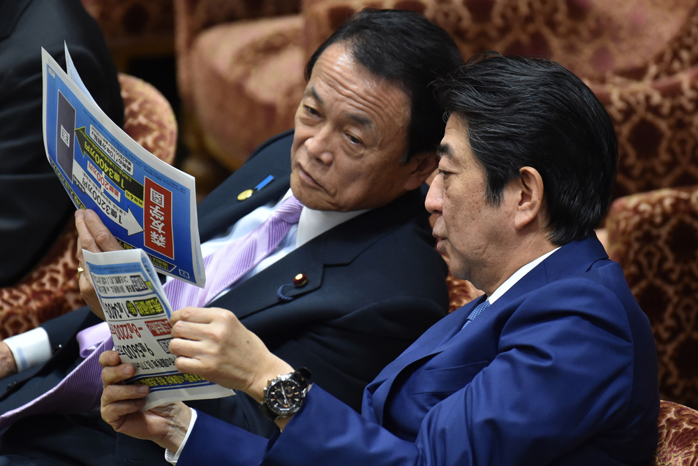 圖:日本首相安倍晉三(右)與副首相麻生太郎24日出席會議\法新社