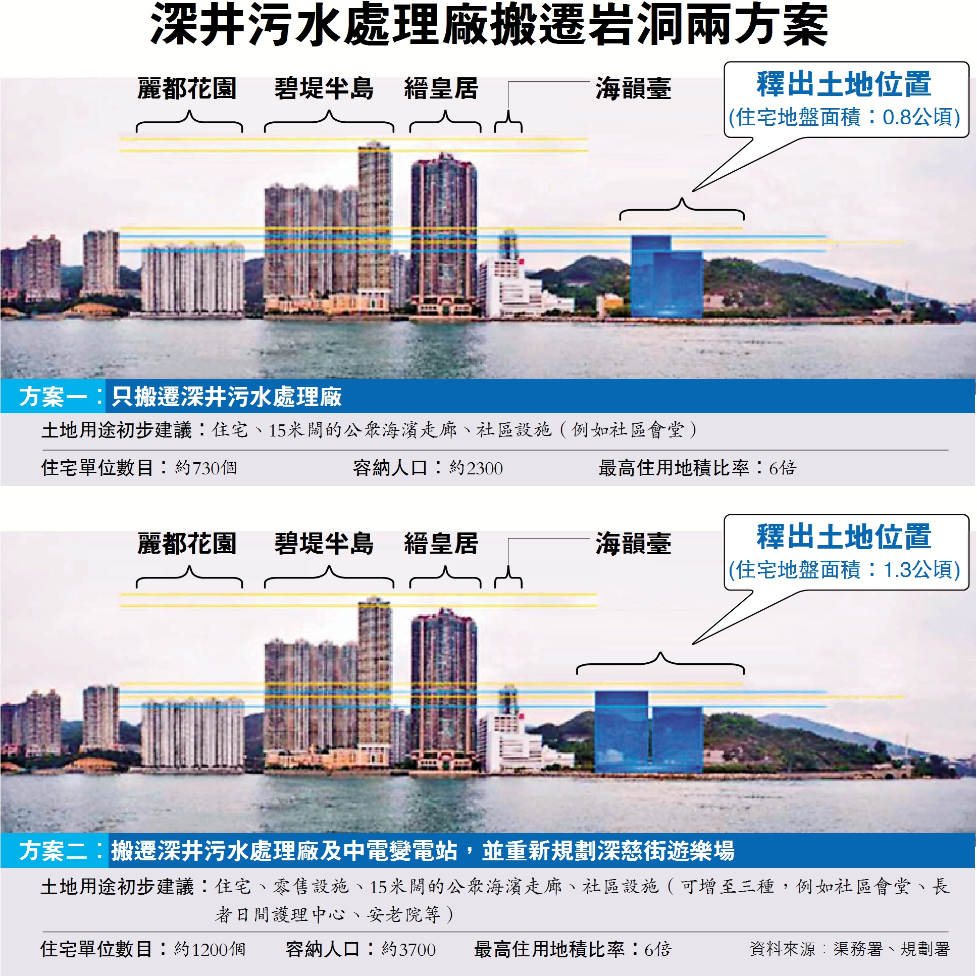 □深井污水處理廠遷入岩洞的計劃,發展局提出新方案,擬擴大搬遷設施範圍,將毗鄰的中電變電站一併搬遷,並重新規劃深慈街遊樂場,令釋出可興建住宅與社區設施的土地面積,由原來的0.8公頃增至1.3公頃,可建住宅單位由約730個增至約1200個,臨海地皮可興建15米闊的海濱長廊(見圖)。當局本月起會就兩個方案,展開第二階段公眾諮詢。