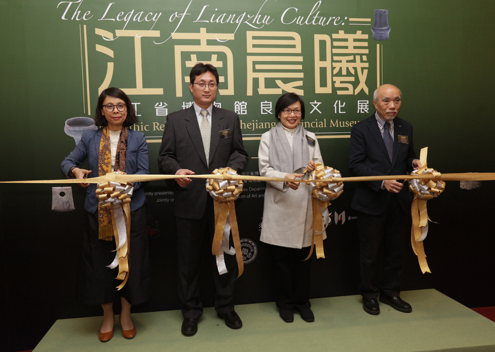 圖:良渚文化展開幕式:(左起)譚美兒、雍泰鶴、許曉暉、羅榮生主持剪綵\大公報記者林少權攝