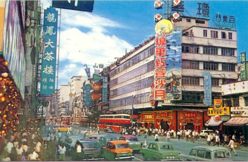 圖:七十年代旺角的龍鳳茶樓及瓊華酒樓隔着馬路相對,逢端午及中秋各置大型綵牌鬥法,吸引路人圍觀
