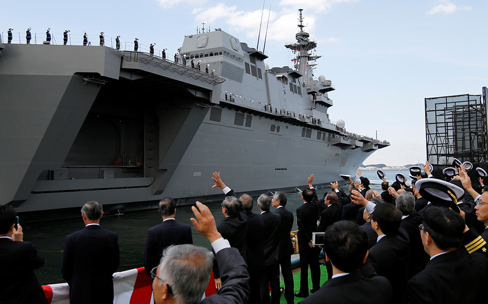 圖:日本國防部官員在岸邊揮手,目送「加賀」號啟動 路透社