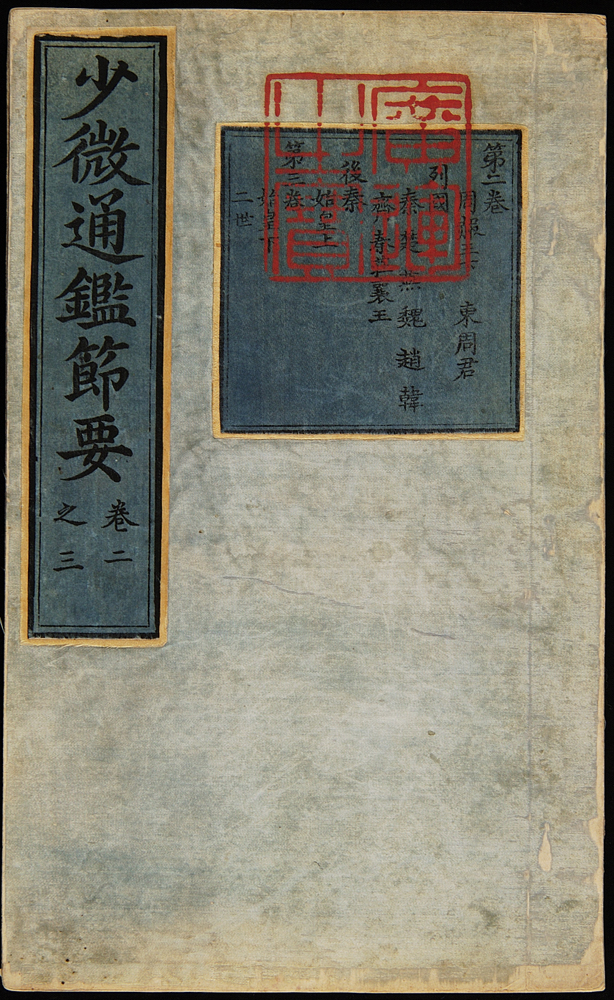 館藏一部《少微通鑒節要》五十卷,四十冊,(宋)江贄撰,續編(明)張光啟撰。明正德九年(Z一五一四)內府刻本。半頁九行,行十五字,小字雙行同。四周雙邊,黑口,雙黑魚尾。此書保持原包背裝。封面貼藍色雙欄長方籤,墨書「少微通鑒節要卷×之×」。書籤右側有藍色雙欄正方形籤,上面墨筆小字題寫本冊的具體內容,其上鈐「廣運之寶」的朱文方印。書中亦鈐「瀋陽惕庵王氏藏書印」朱文方印、「半巢書屋」白文方印、「北平李氏榮青珍藏書畫之印」朱文方印。
