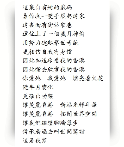 《香港.我家》由馬敬恆、馮允謙作曲,向雪懷填詞,共有10名本地著名歌手合唱,包括李克勤、楊千嬅、周柏豪、陳柏宇、鄭欣宜、江海迦、王灝兒、洪卓立、許廷鏗及林欣彤,一起唱出「讓美麗香港,新添光輝年華」、「傳承着過去叫世間驚訝」。歌詞如上圖: