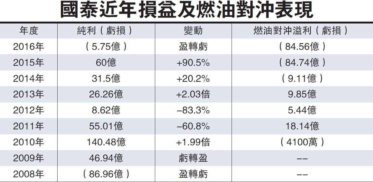 國泰早前公布的業績顯示,燃油對沖錄得84.5億元虧損,三年合計蝕近180億元,而國泰於2011至13年,只從對沖燃油獲利約33億元,可謂賺少少輸多多。面對去年業績終於蝕入肉,國泰將對沖年期從目前的四年縮短至兩年,但對沖合約價格分別鎖定仍高達80至90美元。換言之若油價未升至該水平以上,國泰今明年肯定再錄巨額對沖虧損。朱國樑昨日強調,自2015年8月開始,國泰並無增加相關對沖,今年期油對沖合約亦已比前幾年減少,預計明年會進一步減少,相信即使油價下跌,對集團影響不會很大。
