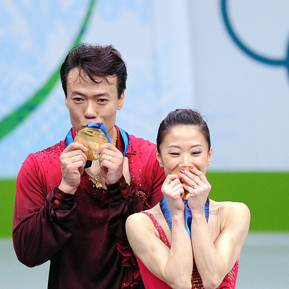 圖為2010年2月15日,申雪(右)/趙宏博在溫哥華冬奧會花樣滑冰雙人滑比賽中,以216.57分的總成績奪冠後親吻金牌/新華社