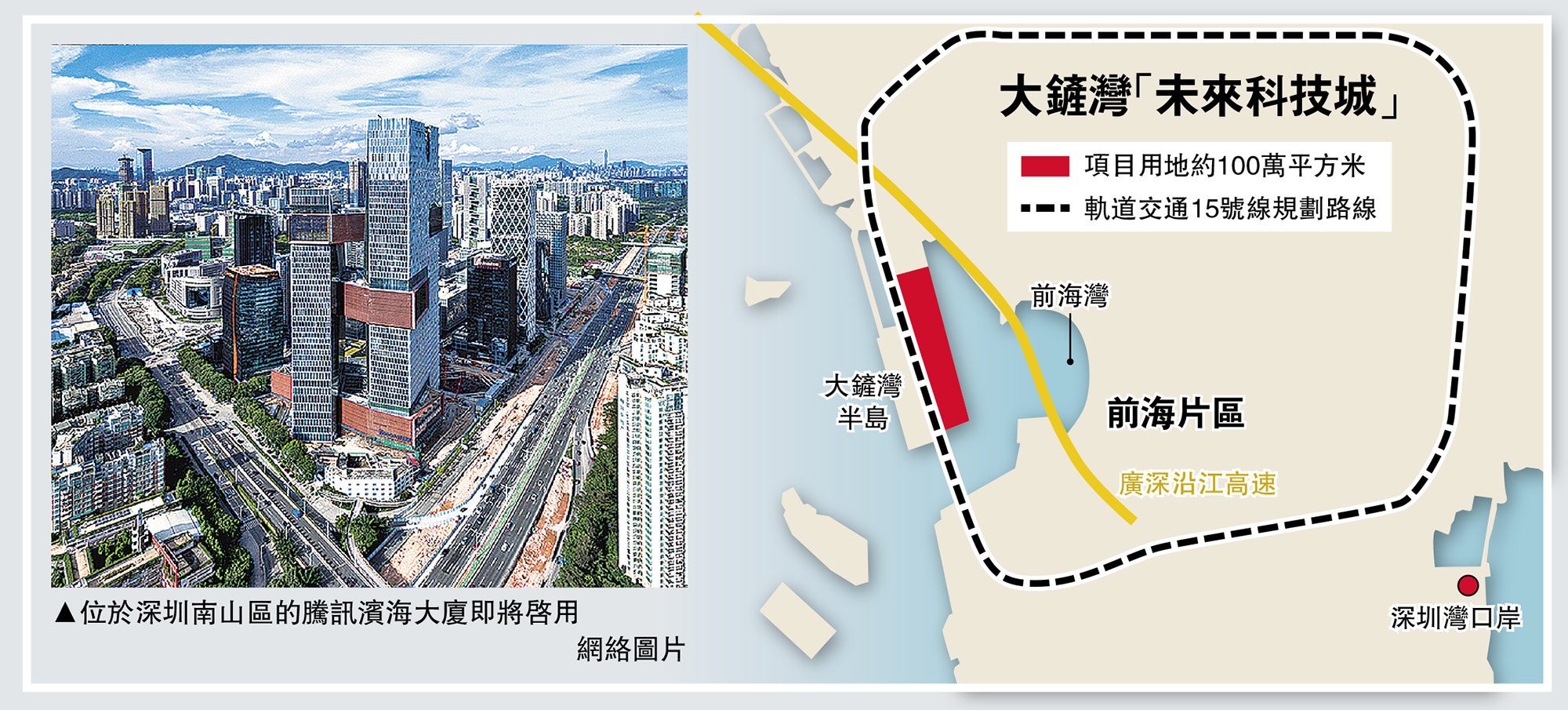□深圳近年來科技創新發展成績亮眼,尤其是「互聯網+」產業,在全球領先。不過由於土地緊缺,許多科技企業發展受限。記者近日了解到,深圳將在前海附近的大鏟灣港區撥百萬平方米讓騰訊主導建設一座「互聯網+」未來科技城。據悉,「互聯網+」未來科技城定位培育世界最頂尖的互聯網企業,並以互聯網平台為基礎,利用信息通信技術與各行業融合,推動產業轉型升級,創造新業務與新模式,運用智慧城市的理念,建設現代化創新型城市示範區。/大公報記者李望賢深圳報道