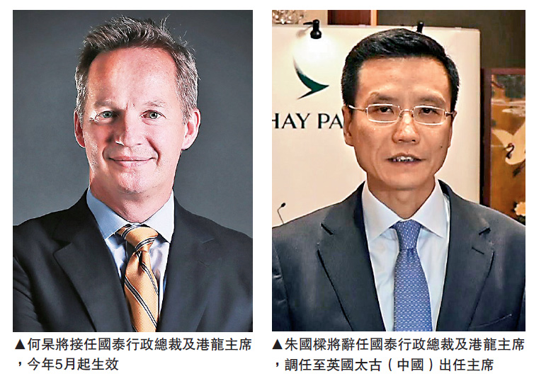 □國泰(00293)易帥傳聞已久,掌舵人朱國樑的去留一直是市場關注的焦點。太古系昨發聯合公告披露,朱國樑將辭任國泰行政總裁及港龍主席,調任至英國太古(中國)出任主席,而國泰現任常務總裁何杲(Rupert Hogg)將接棒朱國樑出任行政總裁及港龍主席,今年5月起生效。/大公報記者 吳涵宇