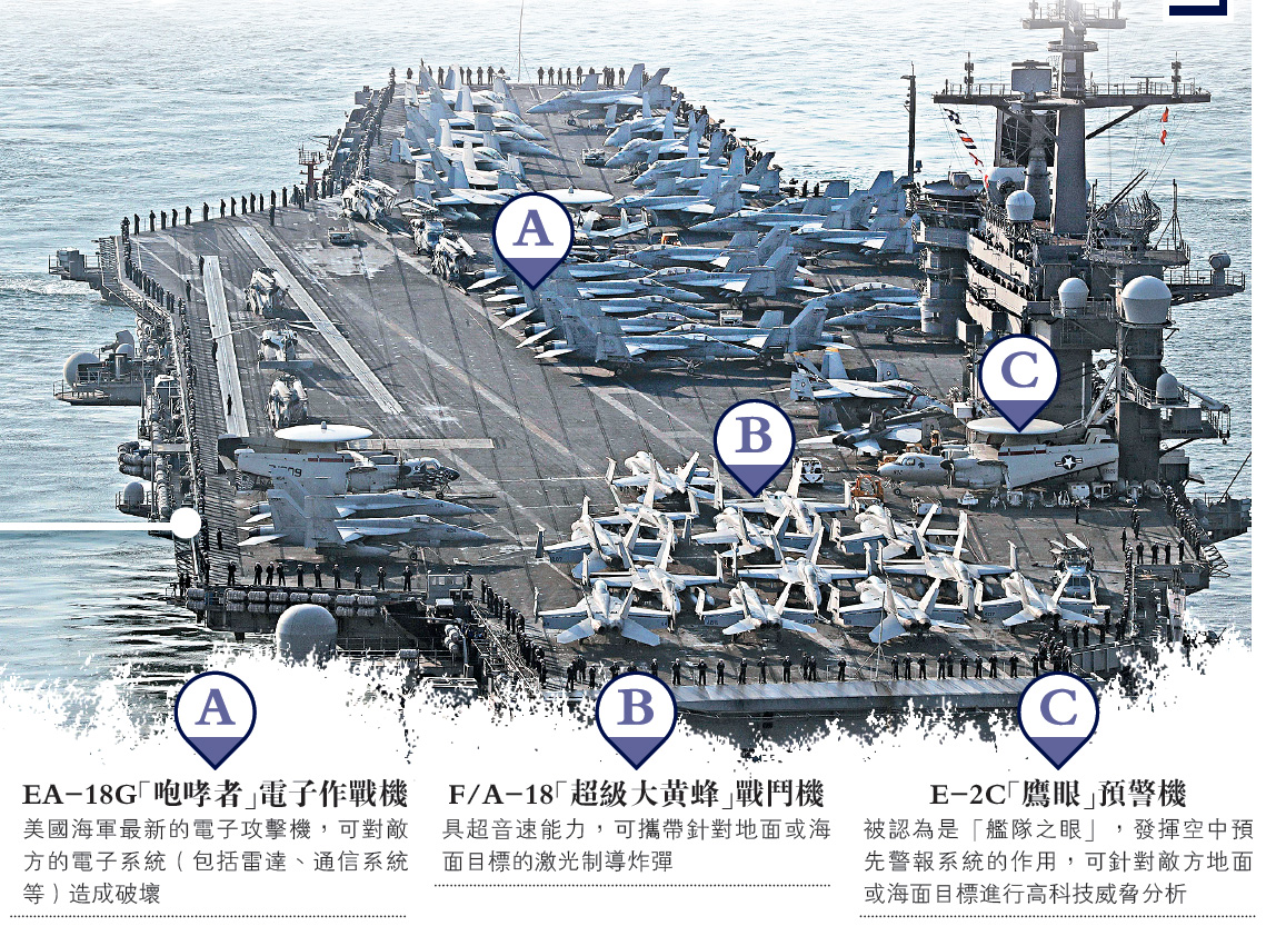 圖:「卡爾文森」號航母打擊群由尼米茲級USS「卡爾文森」號航母與三艘配備「神盾」反導系統的護衛艦組成,可將朝鮮發射的彈道導彈在發射初期或飛行中程擊落